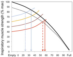 This means that the training load must be set with these factors in mind. The figure below illustrates the interrelationships of inspiratory muscle strength, lung volume, and training load, as well as the effect of fatigue on the VT that can be achieved. Note that the breath volume is clipped progressively earlier in the breath with increasing loads.